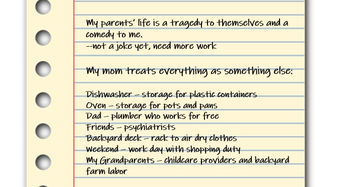 “What is this? Your notebook?” Cindy’s mom cranes her neck and sees the notebook Cindy pulls out for her intended impromptu comedy standup.