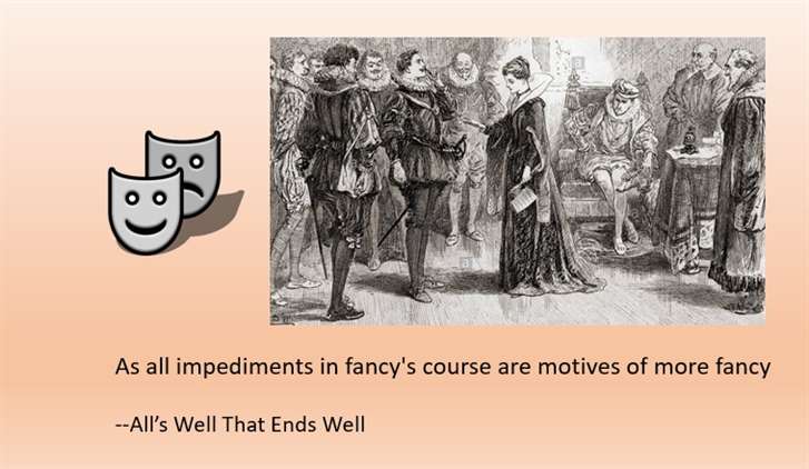 I thought this is a ridiculous story at first. Such a nice and vivacious girl should find somebody who loves her, not this heartless philanderer. With so much energy for love and sacrifice and hard work, she should get someone worthy of her love. I didn’t believe such an event had ever happened or would ever happen; I didn’t believe such a girl had ever existed and would ever exist. It’s just theater and drama, “All’s Well That Ends Well”. Also Shakespeare is never very good with his plot design. Think about “King Lear”. The beginning where King Lear insists on being ardently loved by his three daughters is quite absurd. Do parents make such outrageous demands on their children? “Declare your unconditional love for me, kid. Or I will punish you.” This kind of question will surely receive an answer like, “Dad, are you OK?”