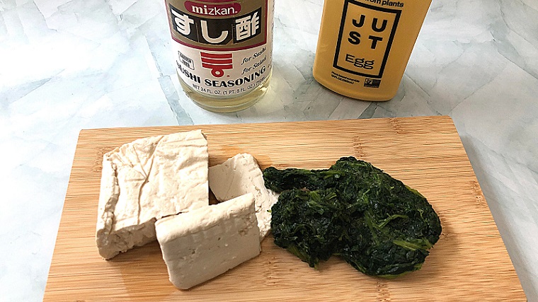 - break up the tofu chunk. You can cut it into small pieces (very small pieces, like 1/3 or a bite size or even smaller) but I am too lazy to cut. So I just use my hand to break the tofu into a little messy heap. I put the tofu into a frying pan. I don’t put oil at this step, but I know most people would prefer adding some oil to the frying pan at this point. I add one table spoon of sushi seasoning and half a table spoon of dark soy sauce. The sushi seasoning is already salted and it is acidic. So you probably need to add a little at first. After a while when the tofu is cooked through, you sample it, and add more if you feel like it. Heat up the pan with high heat. When the pan becomes hot, lower the heat. Cook on low heat for 5 to 7 minutes as tofu slowly soaks up all the sushi seasoning and dark soy sauce. Now you really want to taste it to see if the sourness and the saltiness is to your liking. It should be a little bit on the salty side since you are going to add spinach to it. Tofu is not easy to take on flavors and if it tastes too bland, you want to add more sushi seasoning or dark soy sauce.
